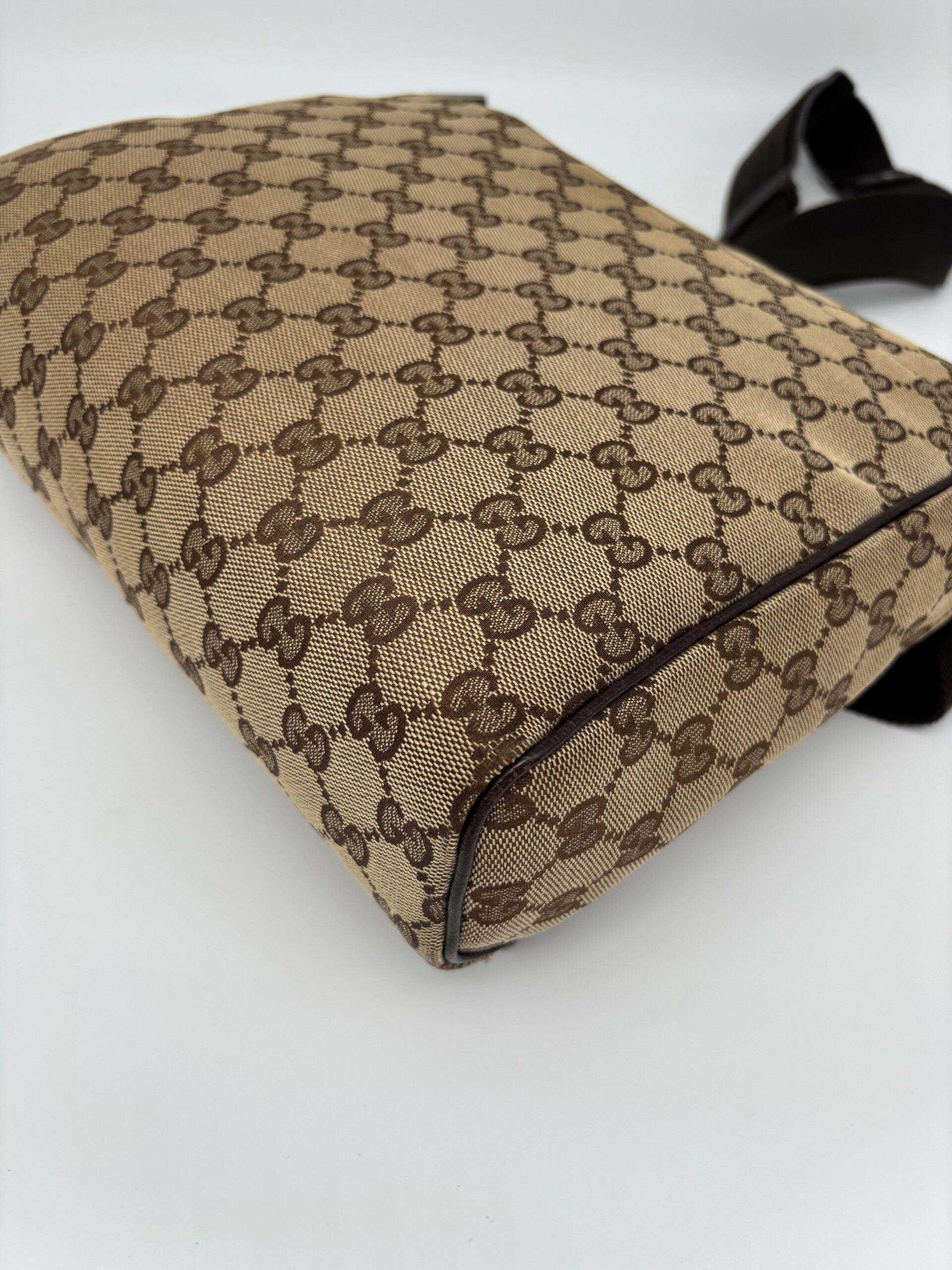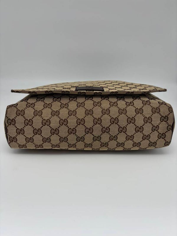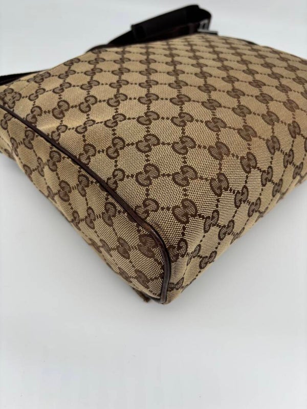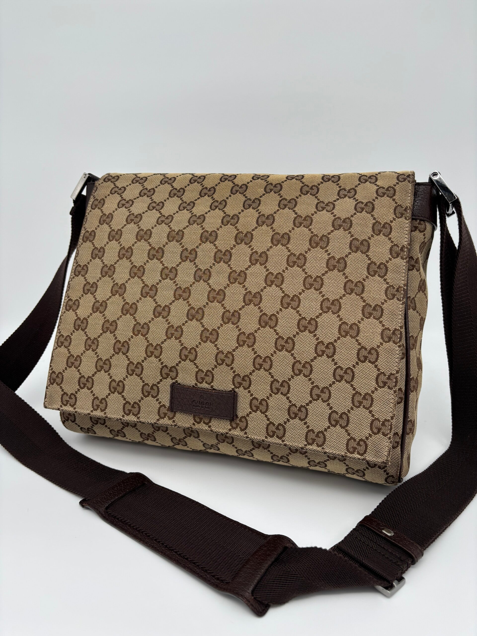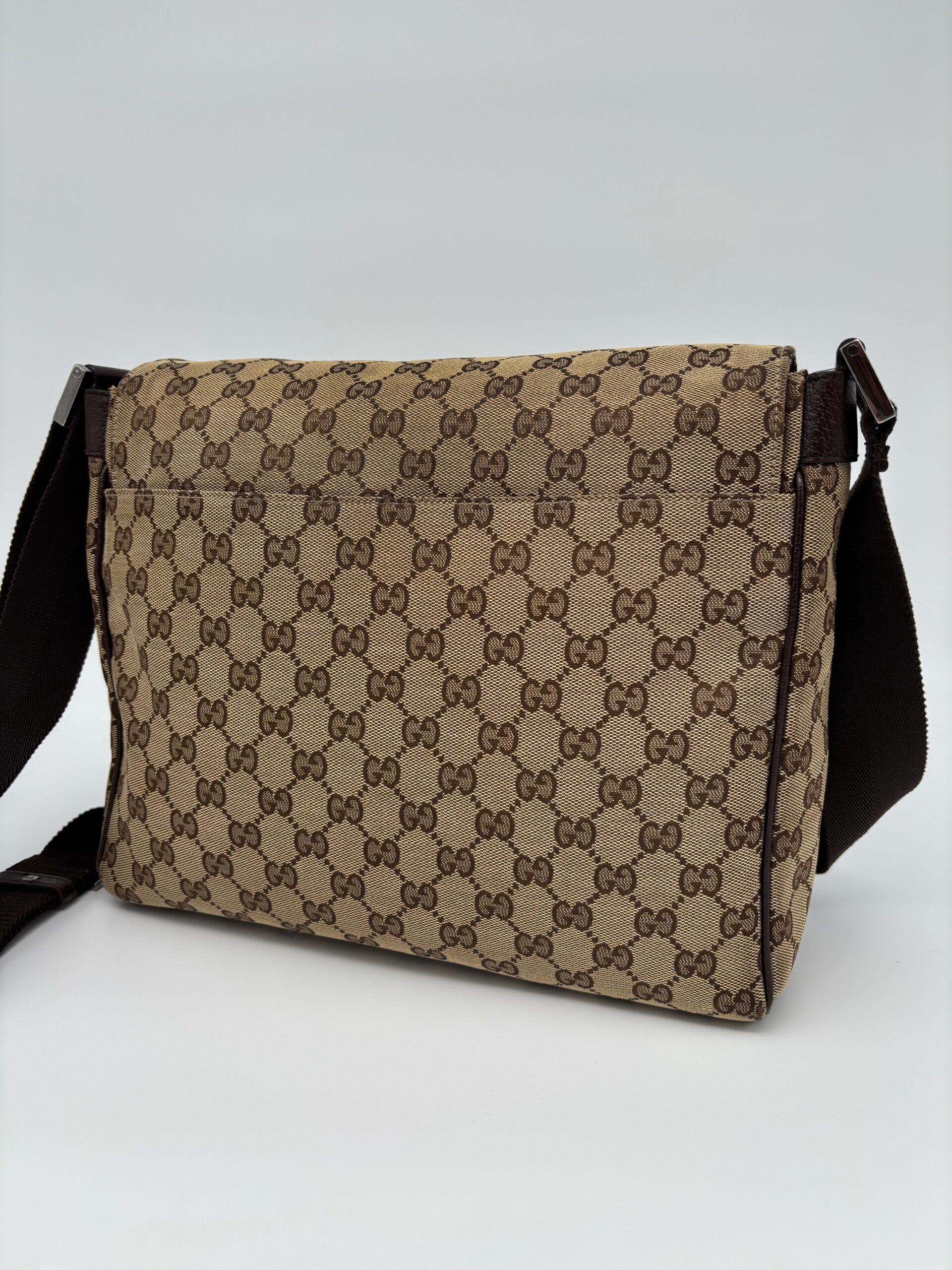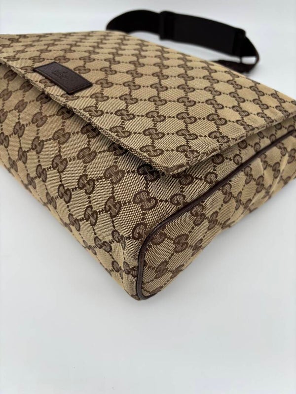 Gucci monogram messenger in zeer goede staat. Kan crossbody worden gedragen en heeft een verstelbare strap. De afmetingen zijn ongeveer 30 x 26 cm. Komt inclusief Veggel Vintage certificaat van authenticiteit.